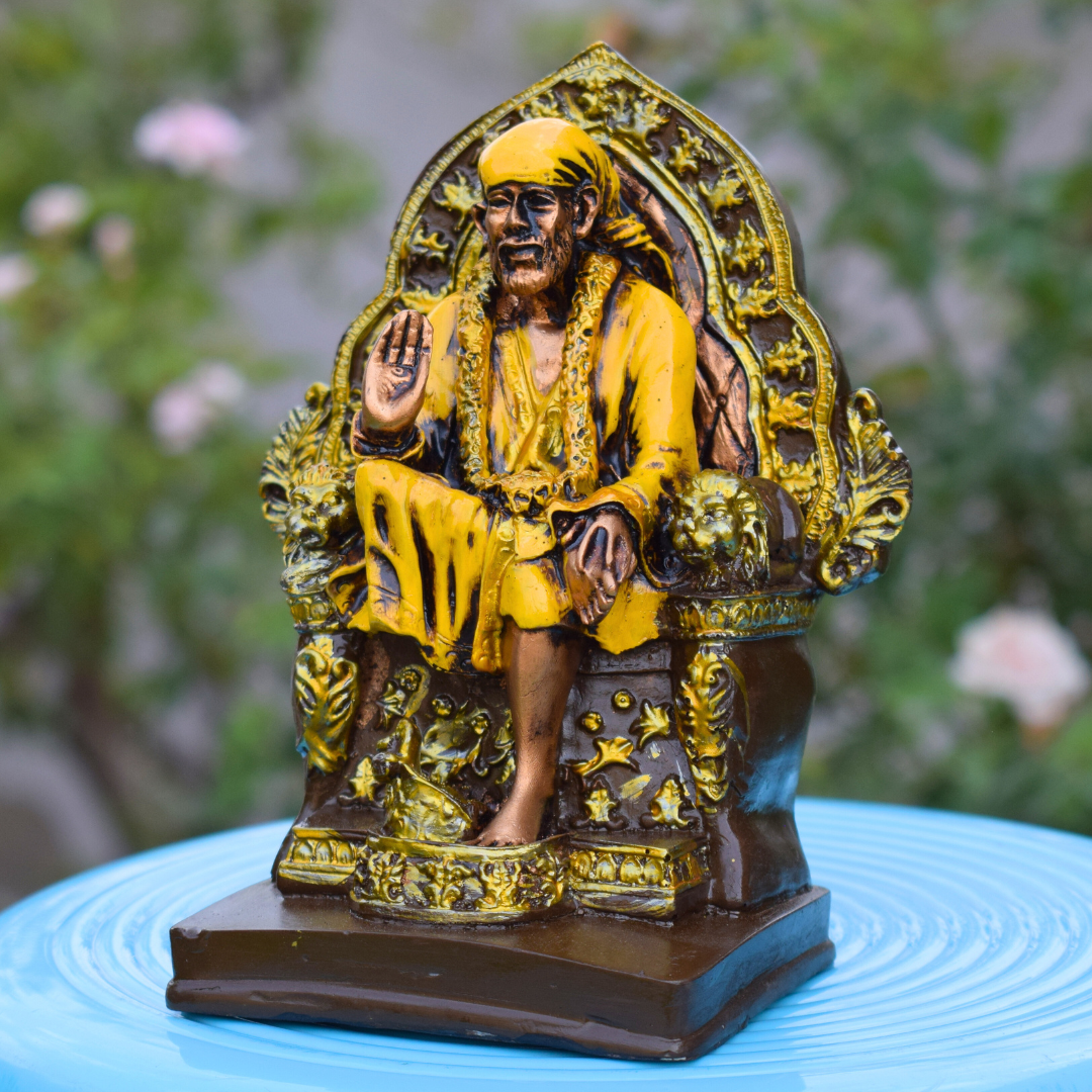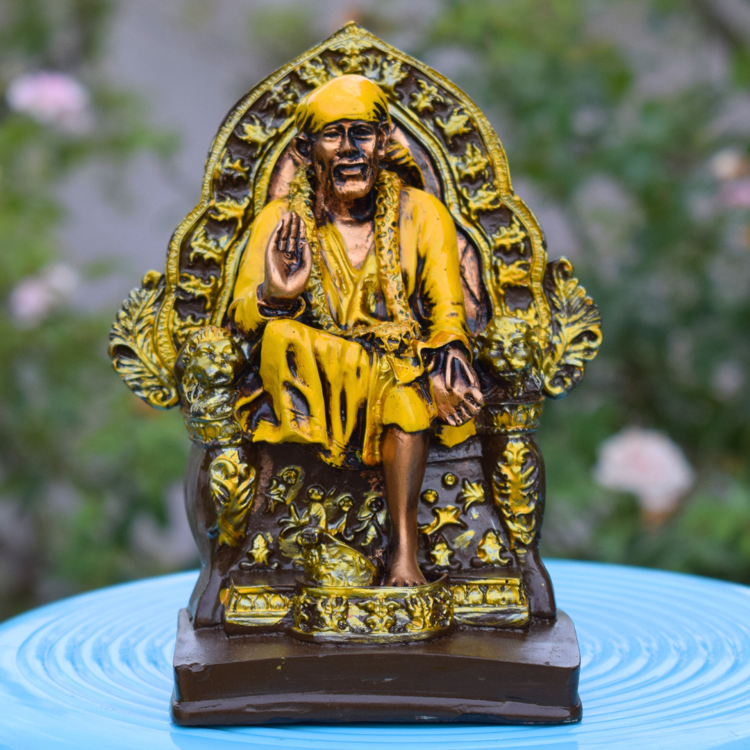 Yellow Sai Baba Statue Sai Nath Idol Sitting on Singhasan for Home Decor